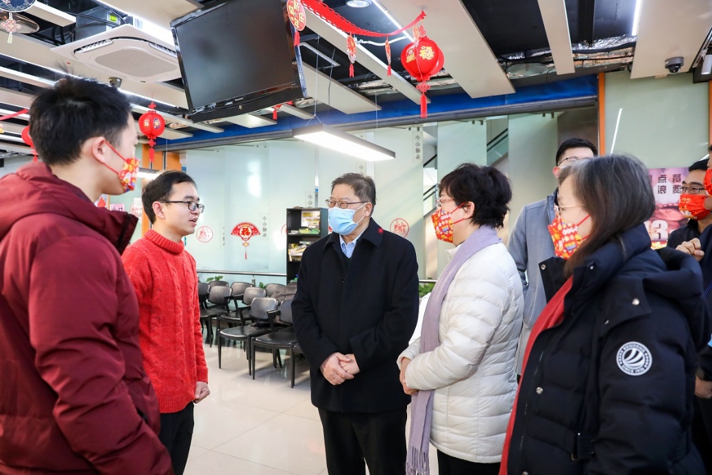 郝平、龚旗煌、陈宝剑、副校长王博、董志勇等来到学生宿舍和食堂,看望慰问留校学生和坚守岗位的教职工。