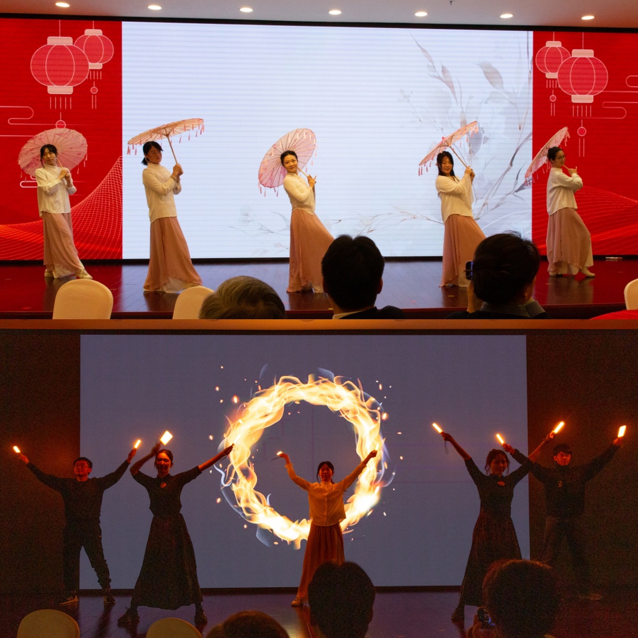 开场舞《山河图》以宏大的气势拉开了活动的序幕,馆员们用灵动的舞姿勾勒出壮丽的山河画卷,瞬间点燃了现场的氛围;计算服务中心带来的健身操《健康到到令》以其活力四射的节奏和整齐划一的动作,进一步点燃了现场的热情;医学图书馆带来的《蛇舞华章》以独特的创意和灵动的舞姿,赢得了现场观众的阵阵掌声;离退休老师与青年馆员代表联袂表演的女声小合唱《祝福祖国》《军民一家亲》歌声深情而真挚,表达了对祖国的深深祝福,也传递了对年轻一代的殷切期望;新馆员们的舞蹈《大家好,这里是新馆员的节目》热情又充满活力,彰显了图书馆新生力量的蓬勃朝气;文献资源服务中心的情景喜剧《文献资源服务中心总动员》以其幽默诙谐的表现方式,生动地展现了图书馆资源采访、谈判、收登、编目、上架等工作流程。沙特分馆的舞蹈《“沙语”宝宝》以轻盈的舞步和欢快的节奏,为团拜会增添了一抹奇幻的色彩。
