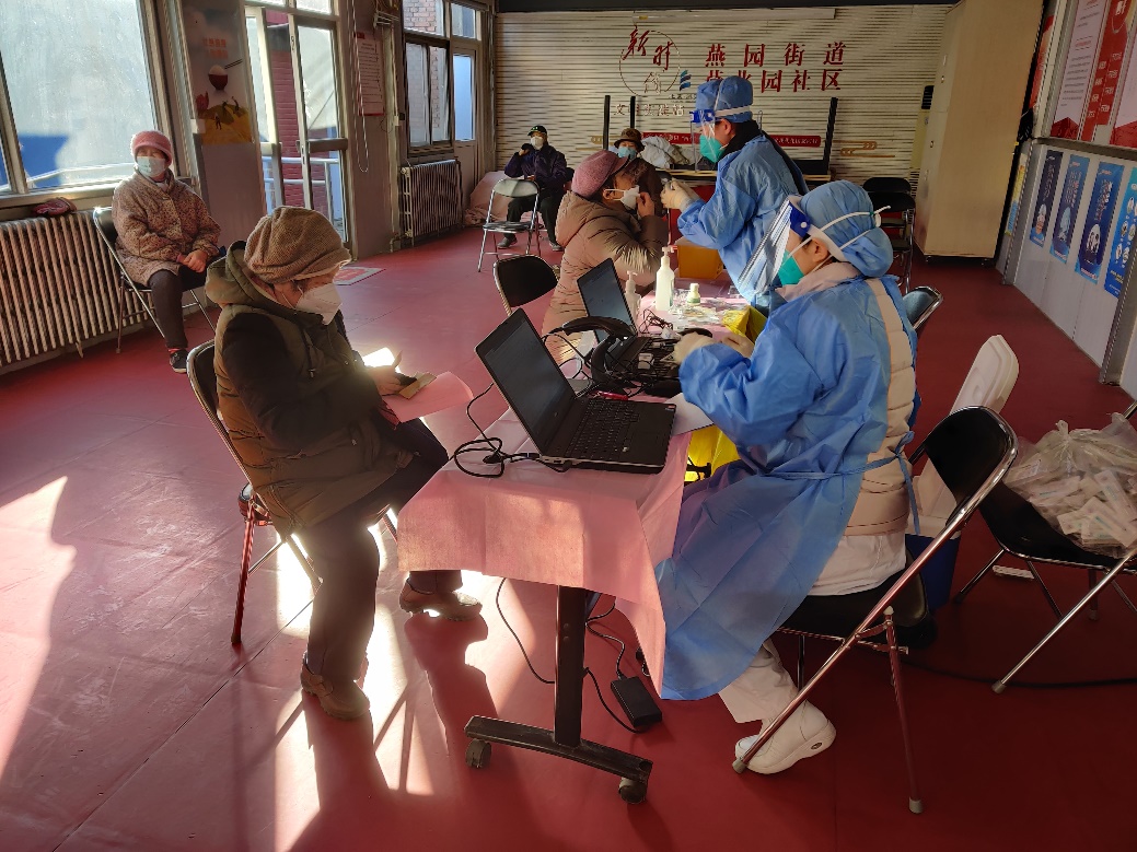 3天时间里,由校医院儿科医生郝素芳、保健科护士长白文文等5位医护人员组成的小分队马不停蹄地穿梭在燕园街道的6个社区之中,为老年居民接种新冠疫苗。