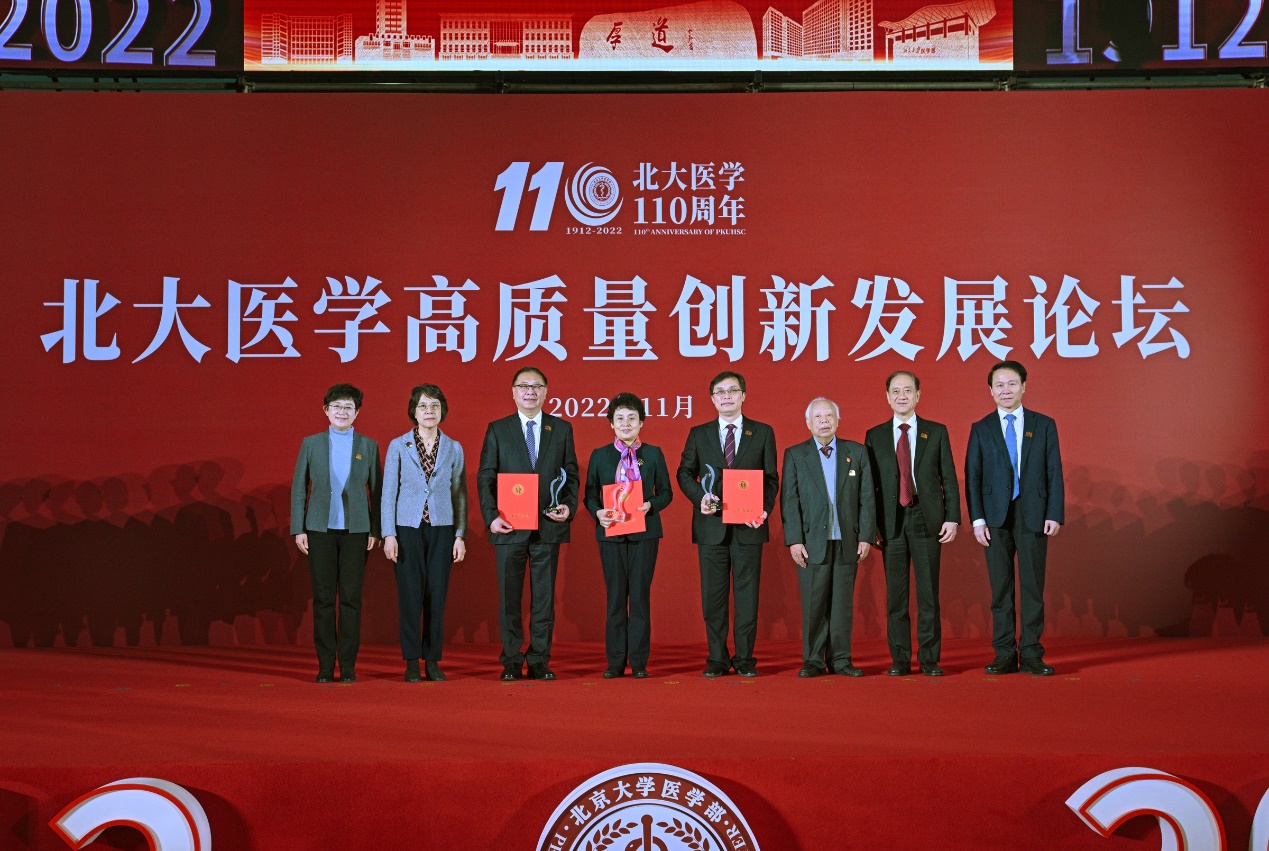 “北医杰出校友”称号是医学部授予校友的最高荣誉,自2012 年百年庆典以来,分别于2017 年和2022 年授予8 名校友“北医杰出校友”称号。现场对他们进行集体表彰,他们是:2017 年“北医杰出校友”称号获得者林东昕校友、黄璐琦校友,2022 年“北医杰出校友”称号获得者林蕙青校友、田伟校友、王松灵校友、胡毅校友、许捷校友和庄涛校友。