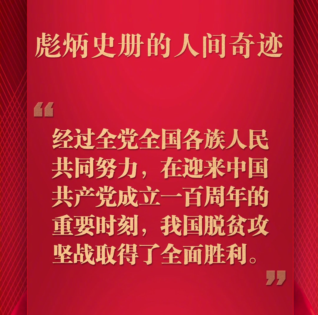习近平在全国脱贫攻坚总结表彰大会上发表重要讲话,庄严宣告,经过全党全国各族人民共同努力,在迎来中国共产党成立一百周年的重要时刻,我国脱贫攻坚战取得了全面胜利,现行标准下9899万农村贫困人口全部脱贫,832个贫困县全部摘帽,12.8万个贫困村全部出列,区域性整体贫困得到解决,完成了消除绝对贫困的艰巨任务,创造了又一个彪炳史册的人间奇迹!这是中国人民的伟大光荣,是中国共产党的伟大光荣,是中华民族的伟大光荣!